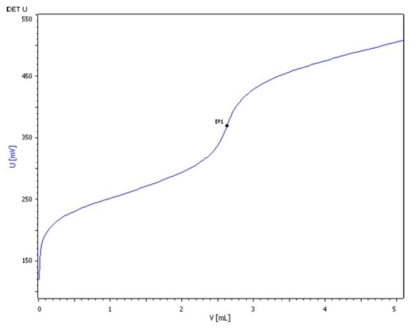 25 mL of the filtrate is placed into a 100 mL beaker and made up to 60 mL with ethanol. The solution is titrated with c(HClO4) = 0.1 mol/L in acetic acid until the first equivalence point is passed.