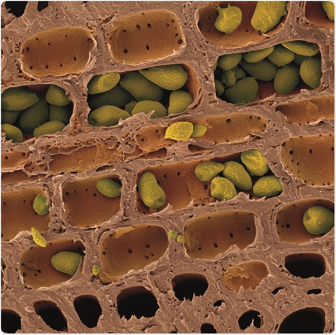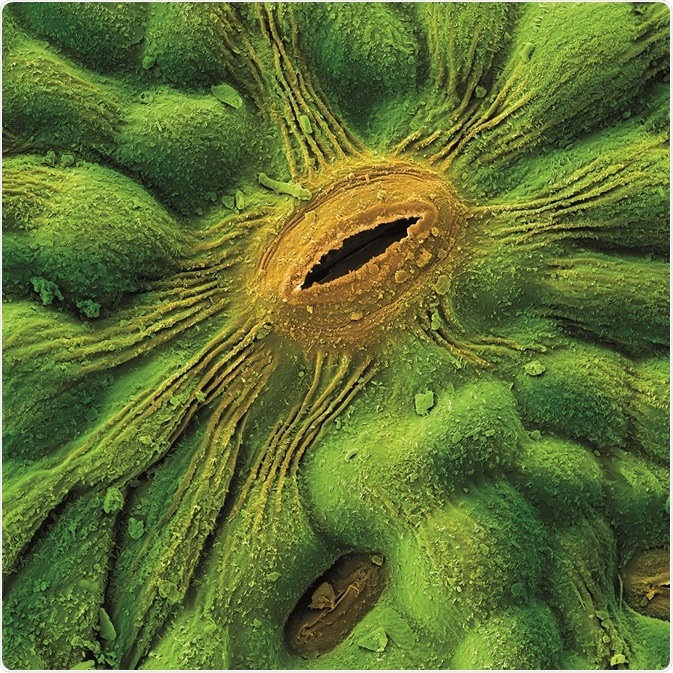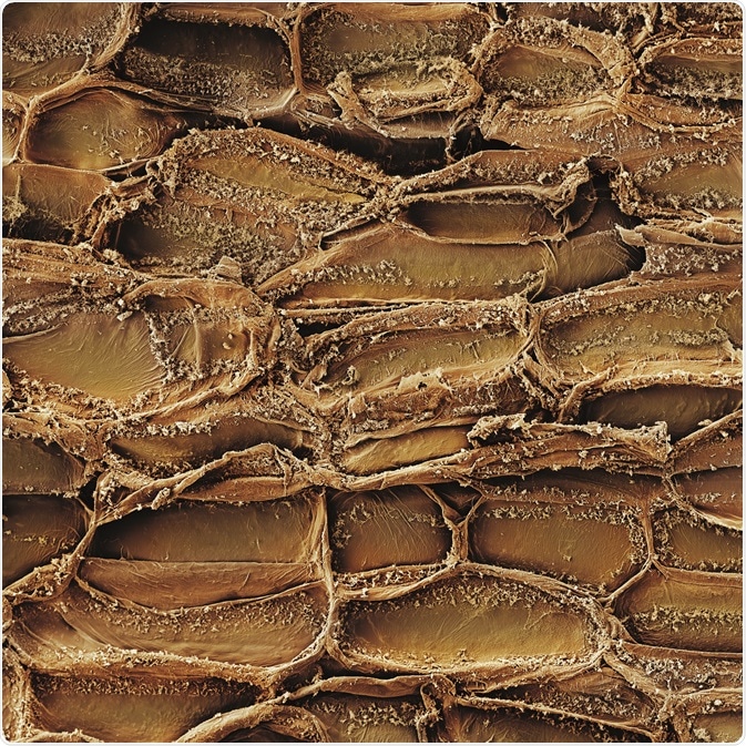 Left: Grape leaf – Details of a stoma, a respiration pore located on the underside of a grape leaf. Stomata are used for nutrient exchange (e.g. carbon dioxide and oxygen) between the plant and surroundings. Right: Kura – Similar to human skin, bark is the dead tissue on the outer layer of a tree. It serves to protect the tree from excessive water loss, regulates gas exchange and excretes some metabolites. Shown here are dead epidermis tissue cells.