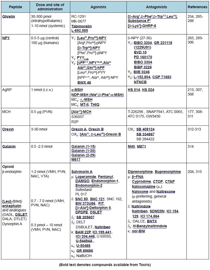 A summary of the featured peptides, plus their receptors and anatomical distributions, can be found in Table 1. Tables 2-4 show the commonly employed doses, antagonists, and agonists of the peptides discussed.