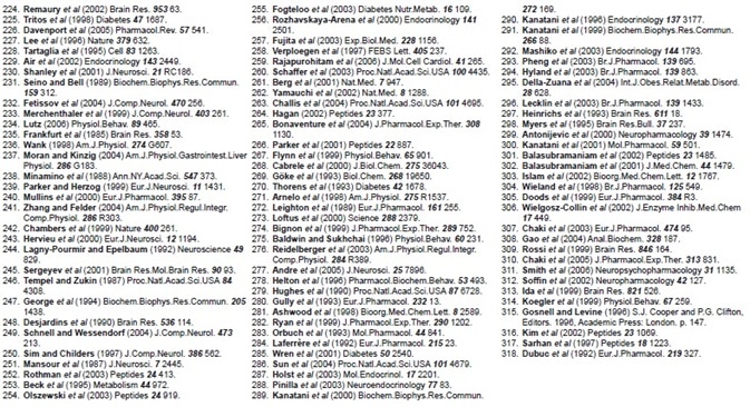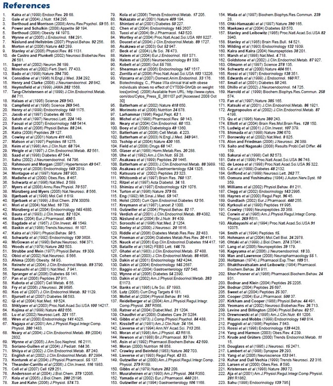 This article has discussed some of the basic evidence implicating these putative orexigenic and anorexigenic peptides in the complex regulation of body weight, appetite, and energy homeostasis. The list of candidate signals will no doubt expand further, and a variety of non-peptide transmitters exist which have not been discussed, but which are strongly associated with these processes.