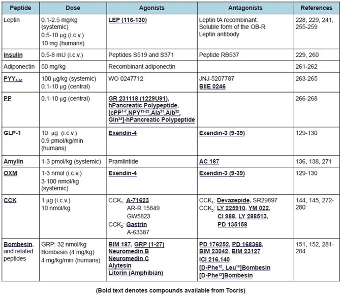 Table 2. Peripheral anorexigenic peptides. Commonly used doses, agonists, and antagonists.