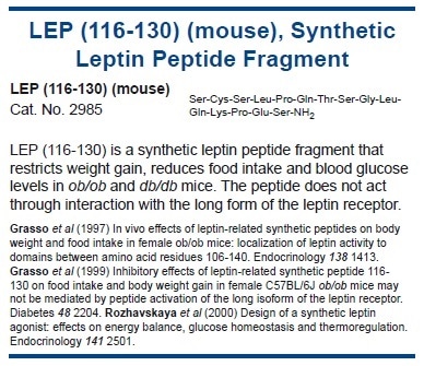 It has been proposed that leptin conveys information to the hypothalamus concerning the amount of energy stored in adipose tissue. Heightened levels are suggested to suppress appetite and influence energy expenditure to regulate body weight. Administration of leptin has been found to decrease food intake in all species studied to date,15 including rodents,18,19 humans,16 non-human primates,17 and sheep.20