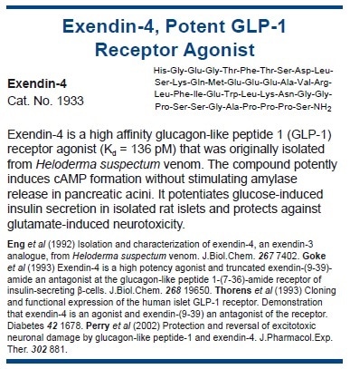 Additionally, GLP-1 induces conditioned taste aversion suggesting that the peptide may suppress feeding by inducing a sensation of sickness.122 Human studies with exendin-4 (exenatide), a naturally occurring peptide with sequence homology to GLP-1, have shown it produces significant reductions in body weight.123 The therapeutic potential of extendin-4 is limited by its side effects, which include nausea and vomiting.124