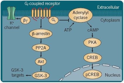 Activation of Gi/o protein-coupled receptors results in both positive regulations of K+ channels by the Gβγ subunit and inhibition of adenylate cyclase activity by the Gαi subunit. This influences the conversion of adenosine triphosphate (ATP) to cyclic adenosine monophosphate (cAMP), and so, the activity of protein kinase A (PKA).