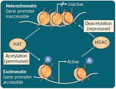 Histone acetylation is catalyzed by histone acetyltransferases (HATs), and this alteration can be reversed by using the enzymatic action of histone deacetylases (HDACs), which can be split into four different phylogenetic classes.