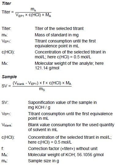 An appropriate amount of sample (see the below calculation) is put into the titration vessel and dissolved in 10 mL acetonitrile. Next, the beakers are covered and the solution is stirred for 30 seconds using stirring rate 8. 10.0 mL TSI solution are added and the sample is covered again and the mixture stirred using stirring rate 4. 0.5 mL distilled water is added after 5 minutes, the lid is closed again and the solution is stirred for another minute using stirring rate 4.