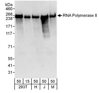 Figure 3. Detection of human and mouse RNA Polymerase II by western blot. Samples: Whole cell lysate from HEK293T (15 and 50 µg for WB), HeLa (H; 50 µg), Jurkat (J; 50 µg) and mouse NIH 3T3 (M; 50 µg) cells. Antibodies: Affinity purified rabbit anti-RNA Polymerase II antibody A300-653A (lot A300-653A-3) used for WB at 0.1 µg/mL. Detection: Chemiluminescence with an exposure time of 30 seconds. View Bethyl's entire catalog of POLR2A-related antibodies. Image Credit: Bethyl Laboratories Inc.