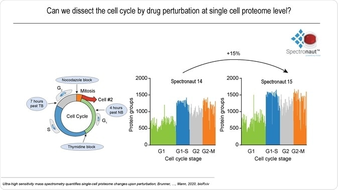 A large-scale single-cell experiment was conducted on whether it was possible to dissect cell cycle-dependent proteome changes using drug perturbation. Single cells at four cycle stages were investigated using the developed LCMS setup and Spectronaut 15, identifying over 1,500 proteins in many individual cells, on average 15% more than with the previous version.