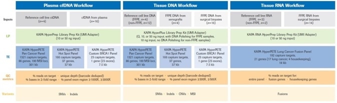 Figure 2. Summary of the experimental design for this study. Full details of reference (cell line), plasma, xenograft, and biopsy samples (inputs) for each of the three workflows are provided in Materials and Methods. Uniquely dual-indexed libraries were prepared as described. For FFPE DNA samples Q=input DNA mass calculated from normalized Q score. Quality control assays (quantification, library fragment size assessment) performed on pre- and post-enrichment libraries are not shown in the diagram, but were performed as described in Materials and Methods. Single (1-plex) captures were performed with all KAPA HyperPETE panels. Data analysis and variant calling was performed with the NAVIFY Mutation Caller. Full definitions of QC metrics are given in Results and Discussion. LP: Library Preparation, TE: Target Enrichment, UMI: Unique Molecular Identifier. Image Credit: Roche Diagnostics Limited.