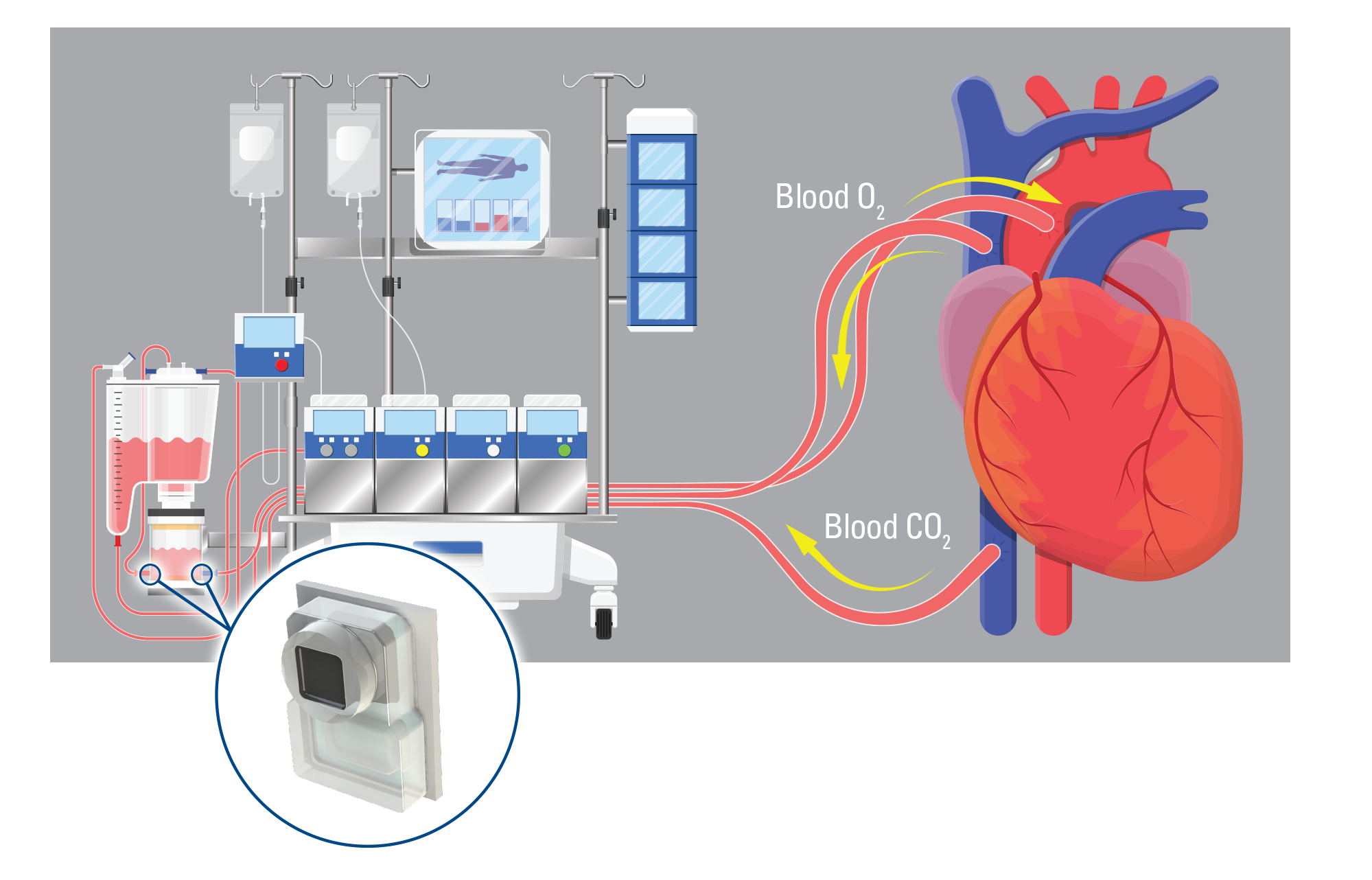 Extracorporeal membrane oxygenation (ECMO) is an important medical application that requires precise online monitoring. ECMO is used for critically ill patients or during certain surgical procedures where the patient’s heart and lung functions are compromised.
