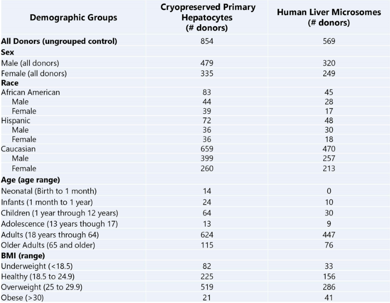 Significant donor variability in metabolic enzyme rates was observed across all enzymes. However, when enzymes such as CYP1A2, CYP2C9, CYP2C19, CYP2D6, CYP3A4/5, and UGT were grouped by gender, race, age, and BMI, no significant differences in average activity rates were detected in either human hepatocytes or human liver microsomes.