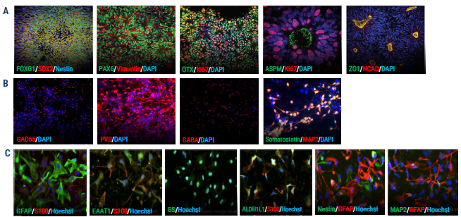 Figure 1. ICC shows expression of key markers for axoCells cortical excitatory neurons (CENs), cortical inhibitory interneurons (CINs) and astrocytes. (A) axoCells iPSC-derived neural stem cells (NSCs, ax0015) show expression of all standard NSC markers: FOXG1, SOX2, PAX6, Vimentin, OTX, Ki67, ZO1 and NCAD. (B) In contrast, axoCells CINs (DIV20, ax0667) express the key markers GAD65, Parvalbumin (PVB), Beta, Somatastatin and MAP2. (C) axoCells iPSCderived astrocytes (ax0665) express key astrocyte-specific markers (GFAP and S100B) and astrocyte-associated markers, EAAT1, Glutamine Synthetase (GS) and ALDH1L1, while showing very low levels of neuronal progenitor markers Nestin and MAP2. Image Credit: Axol Bioscience Ltd