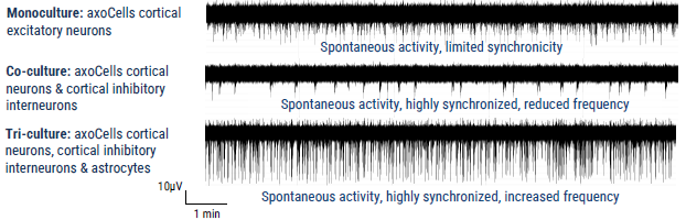 Figure 2. Axion MEA traces of axoCells CENs in monoculture, in isogenic co-culture with axoCells CINs and in isogenic tri-culture with axoCells CINs & astrocytes. The Axion MEA traces above show typical activities on DIV35. In monoculture (Top) the CENs fire frequently and spontaneously but with limited synchronicity. The addition of CINs (Middle) markedly reduces firing rate but switches activity to a more regular synchronized burst firing pattern. The addition of astrocytes (Bottom) increases both firing rate and spike amplitude while maintaining the regular synchronized burst firing seen in the co-culture model. This shows the expected functional modulation with increasing model complexity, demonstrating functional validation of the model. Image Credit: Axol Bioscience Ltd