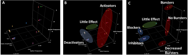Figure 4. 3D scatter plots of measured MEA parameters for blinded compounds and vehicle control. (A) Unclustered data (B) Data clustered by highest level groupings (Little Effect, Deactivators and Activators) (C) Data clustered by sub-groupings (Little Effect, Blockers, Inhibitors, Increased Bursters, Unchanged Bursters and Decreased Bursters). Increased Bursters were identified as potentially proconvulsant, Unchanged Bursters are potentially non pro-convulsant and Decreased Bursters are hyperpolarizing. Created using the software available at https://miabellaai.net/. Image Credit: Axol Bioscience Ltd