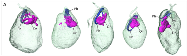 Fig.2: 3D reconstruction of 5 cells which shows colv organelle and the cytopharynx. Image Credit: doi: 10.1128/mbio.01921-23.