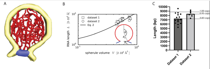 Figure 2. Characterization and quantification of the viral RNA. A: 3D structure of the ds RNA filament obtained by Amira Software. Yellow: membrane, Red: RNA and blue: neck complex base. B: Increase of RNA lengths with spherule volume shown in a graph. C: Estimation of dsRNA length (in base pairs) for two datasets, and average copy numbers per spherule. Image Credit: Thermo Fisher Scientific - Software