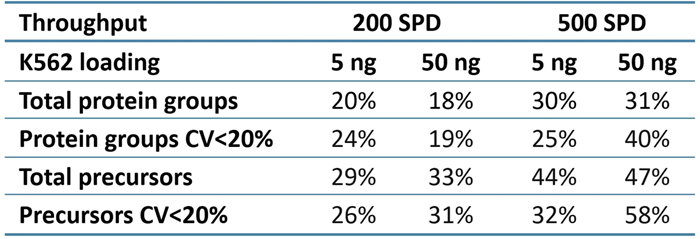 ZT Scan DIA 2.0 increased overall and quantitative identifications for sample loadings and throughputs (Table 2). The improvements were most noticeable at 500 SPD, with protein group gains of up to 40% and precursor gains of up to 58%.