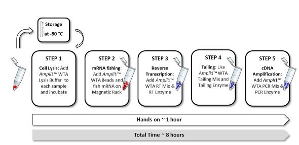 The Ampli1™ WTA Kit only requires a single cell to produce an unbiased, high quality transcriptome library for analysis by RNA-Seq, microarray hybridization, and other downstream methods.
