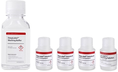 DeepLabel™ Antibody Staining Kit is a set of non-toxic, ready-to-use reagents optimized for use with clarified tissues for effective antibody penetration and site-specific binding. With DeepLabel™, macromolecular probes rapidly and efficiently penetrate thick, protein-dense tissues at lower antibody concentrations. DeepLabel™ facilitates homogenous antibody staining with 2.6 X greater signal-to-background than conventional staining methods. DeepLabel™ is compatible with virtually all antibodies and all cleared tissues (compatible with CLARITY, PACT, iDISCO, CUBIC, etc).