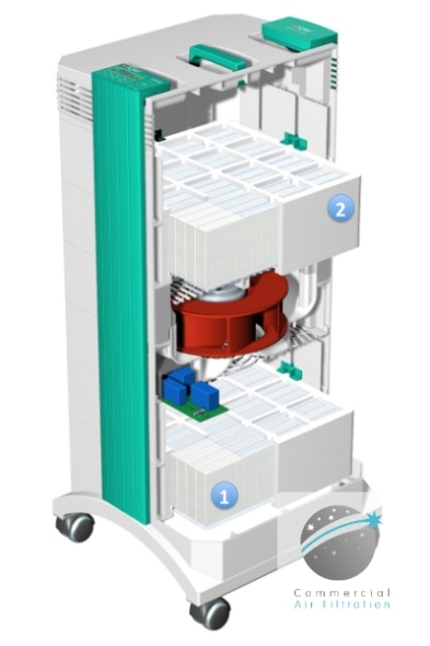 The Cleanroom H13 removes particulate pollution over two filtration stages: