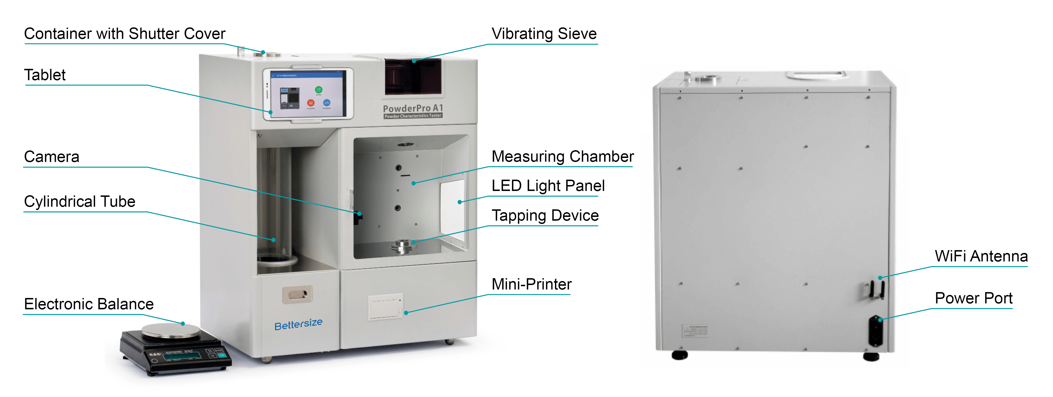 The PowderPro A1 from Bettersize Instruments is a 14-in-1 powder characteristics tester that delivers fast, simple, and accurate scientific test results including Angle of Spatula, Angle of Fall, Angle of Repose, Tapped Density and Bulk Density, Carr Index of Flowability, etc. The PowderPro A1 incorporates several advanced technologies, smart control through Wi-Fi connection, rotating tapped density measurement technology, 3D electromagnetic vibration and image processing technology.