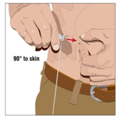 Remove the needle cover. Firmly grasp and pinch at least 1 inch of skin between two fingers.