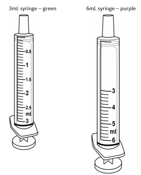 Each pack contains a bottle adapter, two green 3 mL oral syringes with 0.1 mL graduations, and two purple 6 mL syringes with 0.2 mL graduations and the medicine bottle, either: