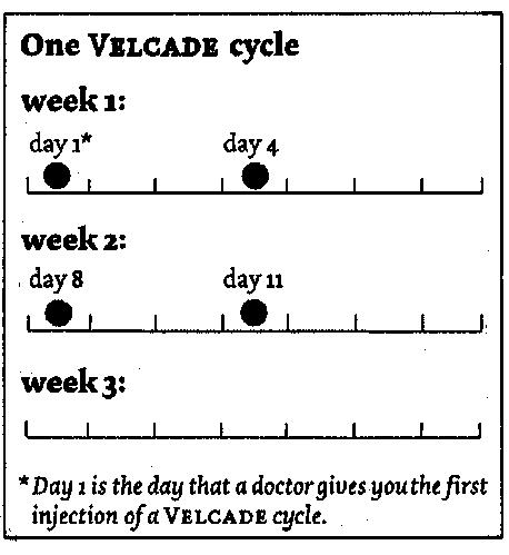 When VELCADE is given with rituximab, cyclophosphamide, doxorubicin and prednisone, one cycle is 3 weeks and the treatment consists of a total of up to 8 cycles (24 weeks). For each cycle, VELCADE is given on days 1, 4, 8 and 11, followed by a ten day break from the treatment.