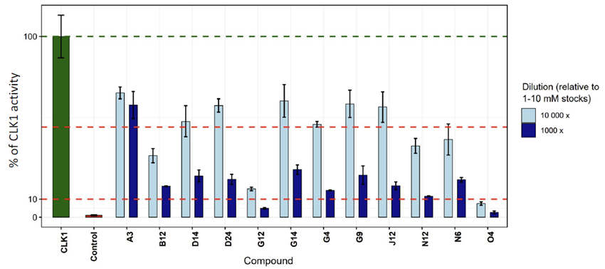 • Initial 100× dilution screen in ADP-Glo → 12 compounds with CLK1 activity <10 %