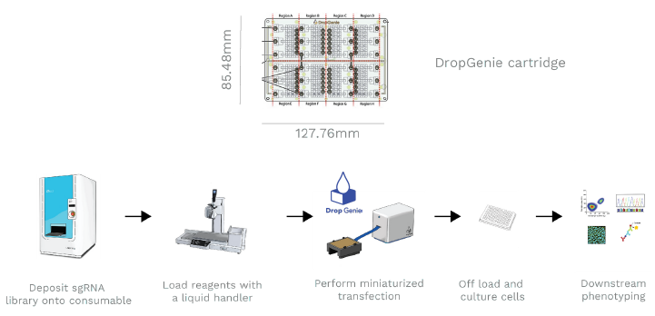 DropGenie Workflow. Guides are deposited onto the DropGenie Chip using an ECHO acoustic dispenser (BCLS), and cells with payload are loaded into the cartridge with a Liquid Handler (Integra Assist+). The system runs with user-defined parameters, after which cells are plated for culture and recovery. Transfection efficiency is then assessed via flow cytometry, sequencing, or fluorescence microscopy. Image Credit: Image courtesy of Wambeke E et al., in partnership with ELRIG (UK) Ltd.
