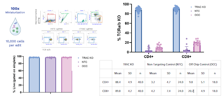 Miniaturized DMF electroporation enables efficient TRAC knockout in primary human T cells. Representative flow cytometry gating strategy (top left) shows singlet, live, and CD4⁺/CD8⁺ T cell populations used to quantify TCRα/β knockout efficiency. Example plots demonstrate loss of TCR expression following TRAC sgRNA editing compared to non-targeting control (NTC). Editing efficiency (top right) was robust in both CD4⁺ and CD8⁺ subsets, reaching ~88–90 % KO across 40 replicates, while controls exhibited only background signal. Cell viability (bottom left) remained >90 % across all conditions. Summary statistics (bottom right) confirm high knockout efficiency with low variability (CD4⁺ mean 88.4 % ± 4.9 %; CD8⁺ mean 89.8 % ± 4.2 %) and strong reproducibility across donors. A total of 10,000 cells per edit were used, representing a 100× reduction in input compared to conventional electroporation systems. Image Credit: Image courtesy of Wambeke E et al., in partnership with ELRIG (UK) Ltd.