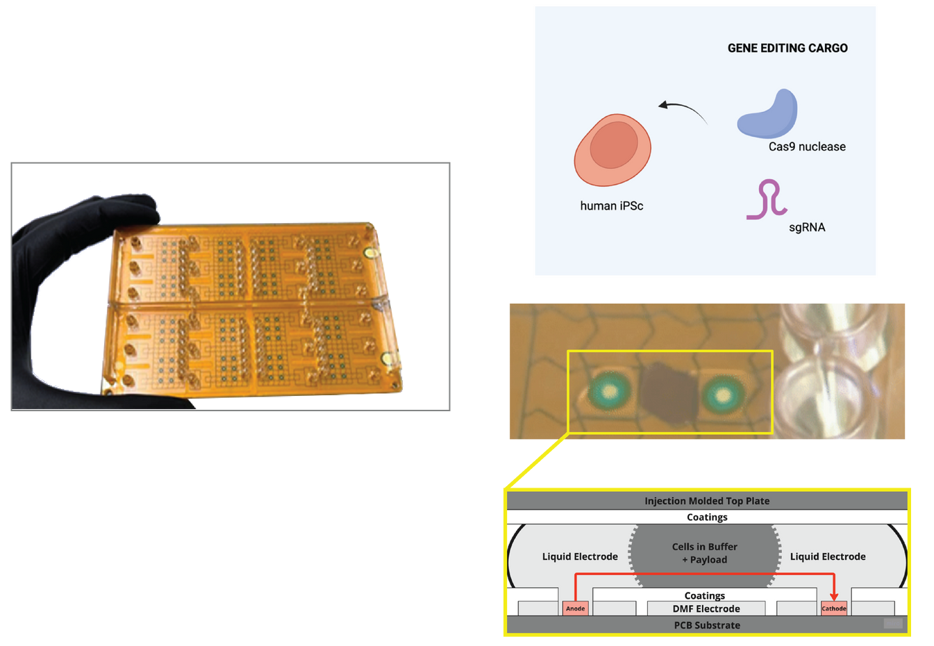 Digital microfluidics enables highly miniaturized electroporation for cell engineering. DropGenie digital microfluidic (DMF) cartridges (left) use patterned electrodes and a modular top plate to manipulate nanoliter-scale droplets. Editing cargo (Cas9 nuclease and sgRNA) and human cells are combined in discrete droplets (top right) and electroporated within microchambers (center). Cross-sectional schematic (bottom) illustrates the DMF architecture, with cells and reagents confined between the coated top plate and PCB substrate. This platform enables 100× miniaturization compared to conventional systems, reducing input requirements to as few as 10,000 cells per edit. Image Credit: Image courtesy of Wambeke E et al., in partnership with ELRIG (UK) Ltd.