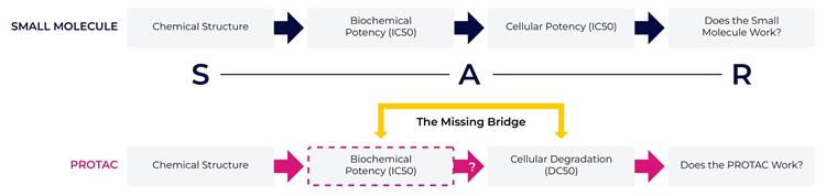 For PROTAC, the SAR is much more difficult than traditional small molecules (inhibitors), since the connection between biochemical and cellular data is not clear. Currently, Western blot is used to evaluate the effectiveness of PROTAC degradation of a target protein, but there is a wide gap between target protein binding and target protein degradation; the “missing bridge”. The high complexity of a PROTAC molecule compared to a traditional small molecule means that robust assays that bridge the gap between the biochemical and cellular data need to be introduced.