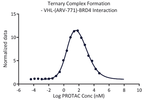 A typical "bell-shaped dose response curve" formed by a PROTAC in a ternary complex formation assay. At ChemPartner we utilize techniques such as TR-FRET and/or AlphaLISA to demonstrate ternary complex formation