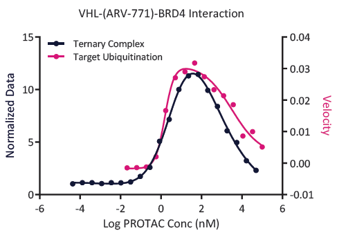 A typical "bell-shaped-curve" formed by a PROTAC in a ternary complex formation assay. vs. ubiquitination assay. This is an enzymatic assay, and for a "good" PROTAC, the ubiquitination peak is similar to the ternary complex peak.