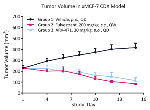 XMCF-7 tumor growth kinetics. Treatment with Fulvestrant and ARV-471 significantly reduced the tumor volume in immunodeficient mice (p<0.0001).