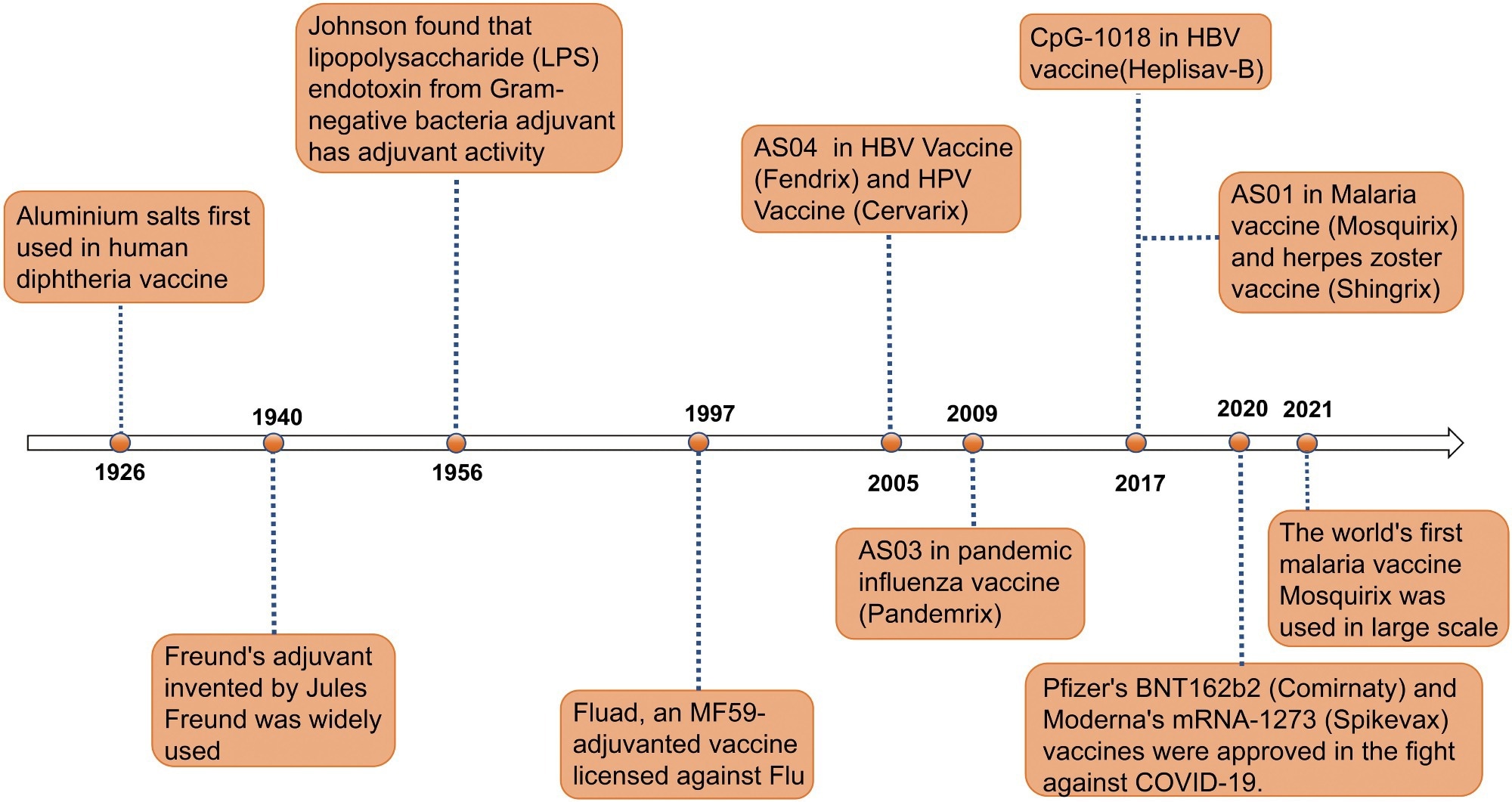 Timeline of major events in the research history of vaccine adjuvants. Since the first use of aluminum salt adjuvants in diphtheria vaccines in 1926, adjuvant technology has gradually evolved. In 1940, the invention of Freund’s adjuvant provided a new direction for enhancing immune responses in vaccines. In 1956, the discovery of the adjuvant activity of lipopolysaccharide (LPS) endotoxins further expanded the range of available adjuvants. In 1997, the application of the MF59 adjuvant in the Fluad influenza vaccine marked the significant role of adjuvants in influenza prevention and treatment. In 2005, the AS04 adjuvant was first used in HBV and HPV vaccines (Fendrix and Cervarix). In 2009, the AS03 adjuvant was used in the pandemic influenza vaccine Pandemrix. In 2017, the CpG-1018 and AS01 adjuvants were applied to the HBV vaccine (Heplisav-B) and malaria and shingles vaccines (Mosquirix and Shingrix), respectively. In 2020, Pfizer’s BNT162b2 vaccine (Comirnaty) and Moderna’s mRNA-1273 vaccine (Spikevax) were approved, making a significant contribution to the fight against COVID-19. In 2021, the world’s first malaria vaccine RTS,S/AS01 began large-scale use, further proving the role of adjuvants in enhancing vaccine efficacy. This timeline illustrates the continuous innovation and breakthroughs of adjuvants in the field of vaccines.Timeline of major events in the research history of vaccine adjuvants. Since the first use of aluminum salt adjuvants in diphtheria vaccines in 1926, adjuvant technology has gradually evolved. In 1940, the invention of Freund’s adjuvant provided a new direction for enhancing immune responses in vaccines. In 1956, the discovery of the adjuvant activity of lipopolysaccharide (LPS) endotoxins further expanded the range of available adjuvants. In 1997, the application of the MF59 adjuvant in the Fluad influenza vaccine marked the significant role of adjuvants in influenza prevention and treatment. In 2005, the AS04 adjuvant was first used in HBV and HPV vaccines (Fendrix and Cervarix). In 2009, the AS03 adjuvant was used in the pandemic influenza vaccine Pandemrix. In 2017, the CpG-1018 and AS01 adjuvants were applied to the HBV vaccine (Heplisav-B) and malaria and shingles vaccines (Mosquirix and Shingrix), respectively. In 2020, Pfizer’s BNT162b2 vaccine (Comirnaty) and Moderna’s mRNA-1273 vaccine (Spikevax) were approved, making a significant contribution to the fight against COVID-19. In 2021, the world’s first malaria vaccine RTS,S/AS01 began large-scale use, further proving the role of adjuvants in enhancing vaccine efficacy. This timeline illustrates the continuous innovation and breakthroughs of adjuvants in the field of vaccines.2