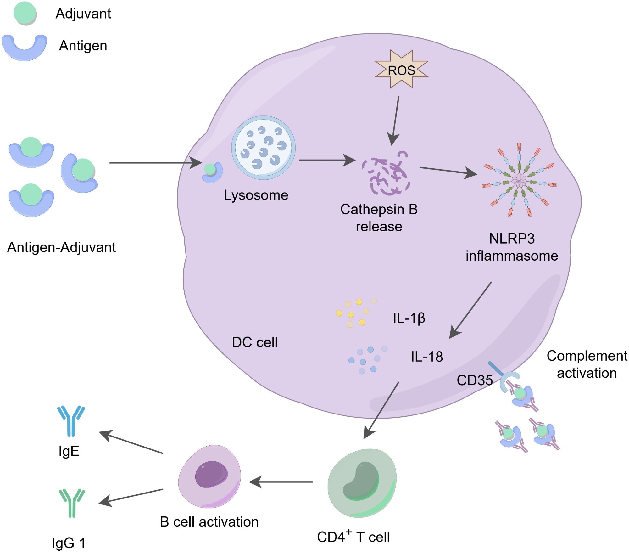 The action mechanism of aluminum adjuvants. Aluminum adjuvants form microparticles by adsorbing soluble antigens, which promotes the phagocytosis of these antigens by APCs. The phagocytosed aluminum-adjuvant-antigen complexes indirectly promote the production of reactive oxygen species (ROS), activate the release of cathepsin B in the lysosome, triggering the activation of the NLRP3 inflammasome and stimulating the production of IL-1β and IL-18, which play a role in regulating immune responses. At the same time, aluminum adjuvants stimulate the activation and differentiation of CD4+ T cells, increasing the levels of IgG1 and IgE. These cytokines and immune factors are essential for effective antibody-mediated immune protection. Additionally, dendritic cells can recruit and deposit antigen-adjuvant-antibody complexes through the CD35 receptor, further enhancing receptor signaling on both B cells and dendritic cells, thereby promoting immune effector functions.The action mechanism of aluminum adjuvants. Aluminum adjuvants form microparticles by adsorbing soluble antigens, which promotes the phagocytosis of these antigens by APCs. The phagocytosed aluminum-adjuvant-antigen complexes indirectly promote the production of reactive oxygen species (ROS), activate the release of cathepsin B in the lysosome, triggering the activation of the NLRP3 inflammasome and stimulating the production of IL-1β and IL-18, which play a role in regulating immune responses. At the same time, aluminum adjuvants stimulate the activation and differentiation of CD4+ T cells, increasing the levels of IgG1 and IgE. These cytokines and immune factors are essential for effective antibody-mediated immune protection. Additionally, dendritic cells can recruit and deposit antigen-adjuvant-antibody complexes through the CD35 receptor, further enhancing receptor signaling on both B cells and dendritic cells, thereby promoting immune effector functions.2