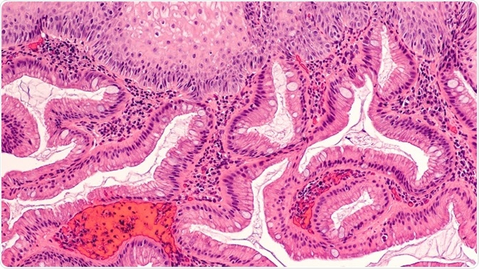 Endoscopic biopsy photomicrograph of intestinal (Barrett's) metaplasia of the esophagus. Credit: David Litman/Shutterstock.com