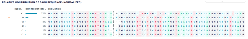 Figure 5. Analysis of inferred sequence contributions following CRISPR editing. This figure shows the allelic variants and their relative proportions in the edited population. Each sequence represents a distinct indel or mutation from Cas9 activity. The black dotted line marks the predicted cut site, and the wild-type sequence is denoted by WT. Image Credit: Image courtesy of T Duboys et al., in partnership with ELRIG (UK) Ltd.