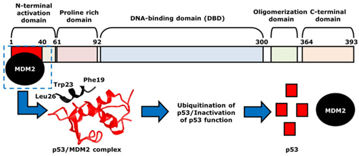 Fig 2. The mechanism of p53- and MDM2-binding. MDM2, indicated as black, binds to p53 at the N-terminal activation domain of p53, or the red area, to form p53/MDM2 complex. Image Credit: Koo et al., 2022