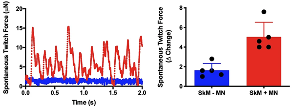 Myomaker organ 2: Spontaneous twitch in muscle organs with iPSC motor neurons (red) and without (blue)