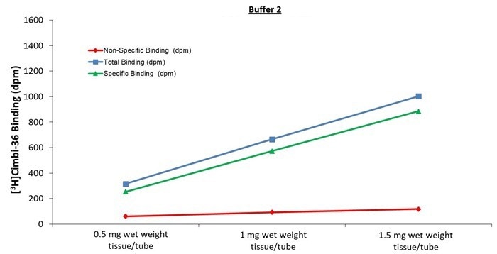 - Specific binding increased linearly with tissue concentration and was greater with buffer 1 (Figure 1) than with buffer 2 (Figure 2). Percentage [3H]cimbi-36 bound with buffer 1 was 8.2 %, 16 % and 23 % at 0.5, 1 and 1.5 mg wet weight tissue/tube, respectively.