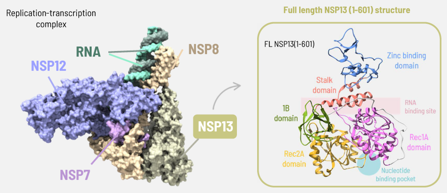 SARS-CoV-2 replication complex and NSP13 domain structure (PDB entry ID: 6XEZ and 6ZSL).
