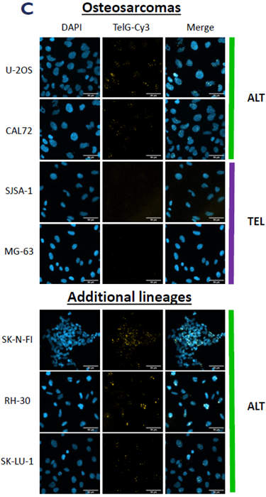 Osteosarcoma models feature heavily in the ALT literature due to the high prevalence of ALT in clinical samples from this lineage and the availability and amenability of these cell lines to in vitro manipulation. The team used the CCA-qPCR and ssTelo native FISH assays to validate a panel of osteosarcoma cell lines for ALT or TEL status based on the presence or absence of the ALT hallmarks.