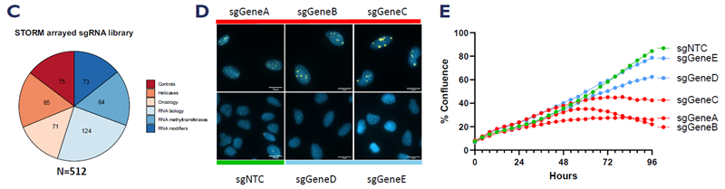 A. Schematic representation of the workflow used to identify modulators of ALT activity. B. Scatterplot showing quantification of foci intensity and number for 512 gene knockouts. C. Composition of the STORM sgRNA library. D. Representative images of ALT suppressors and drivers identified by the screen. E. Incucyte growth curves showing growth defect for loss of genes in Figure D. Image Credit: Image courtesy of Manners O et al., in partnership with ELRIG (UK) Ltd.