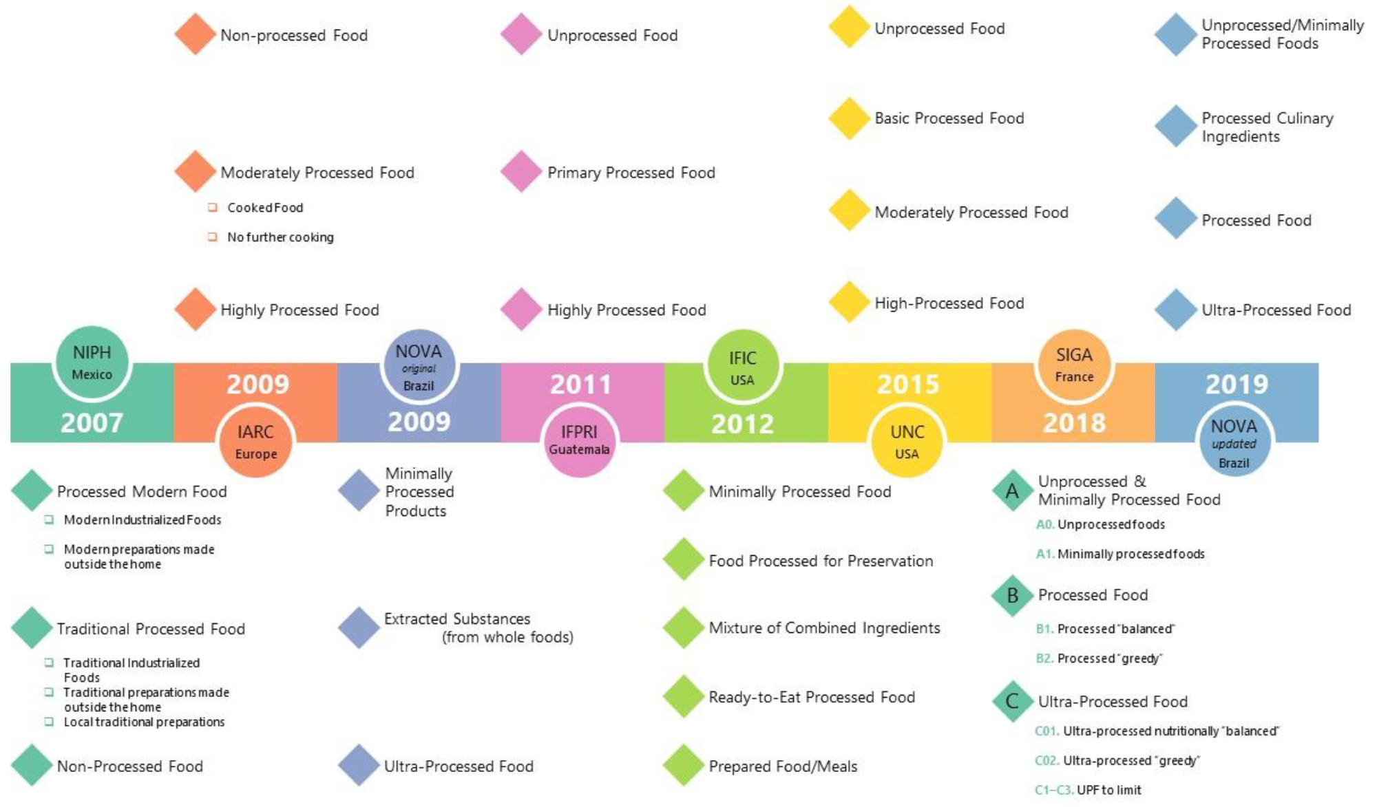 The timeline and summary of primary UPF food classification systems.10The timeline and summary of primary UPF food classification systems.10