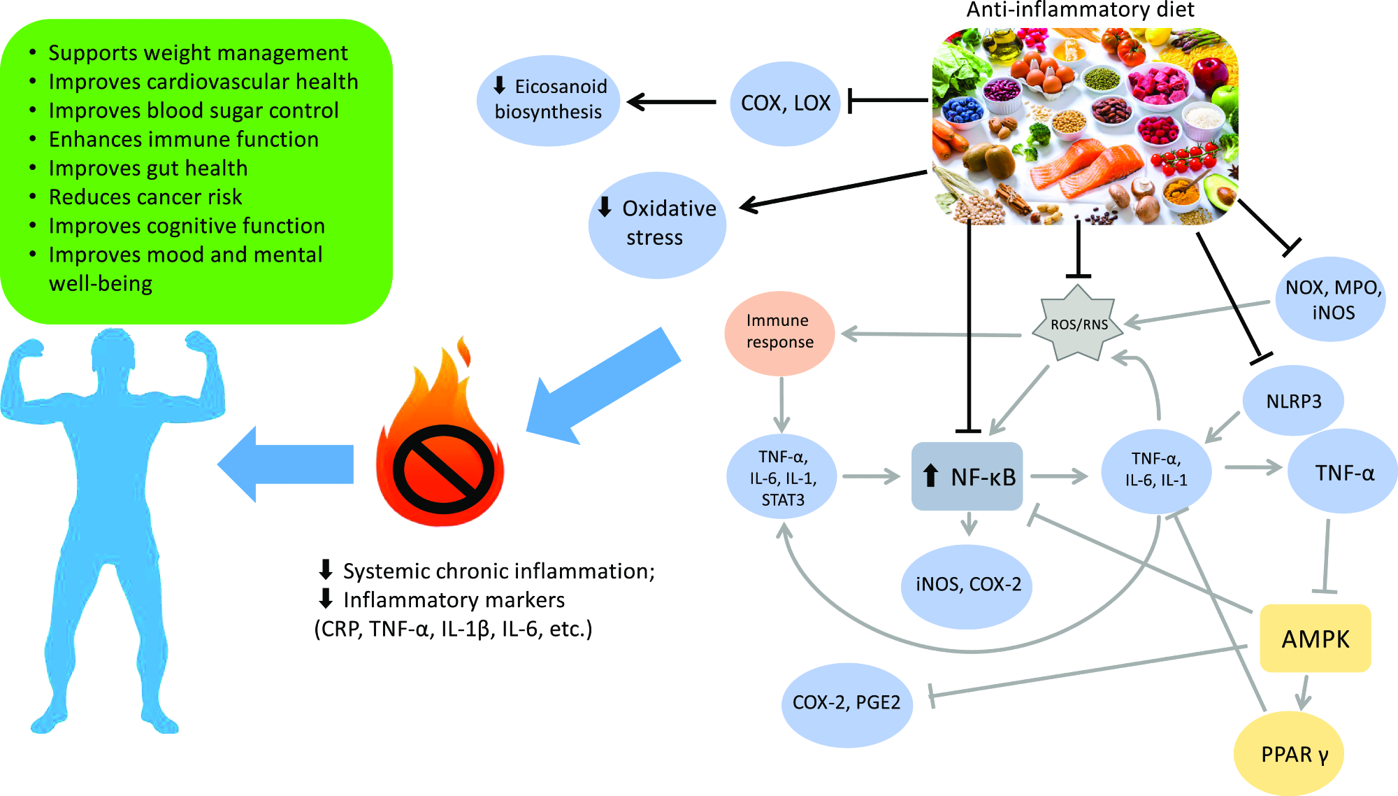 Effects of an anti-inflammatory diet: a visual overview. Gray arrows follow the pro-inflammatory pathway, black arrows and connectors denote the effects of an anti-inflammatory diet. COX, cyclooxygenase; LOX, lipoxygenase; ROS, reactive oxygen species; RNS, reactive nitrogen species; NADPH oxidase, NADPH oxidase; MPO, myeloperoxidase; iNOS, inducible nitric oxide synthase; NLRP3, nucleotide-binding domain, leucine-rich-containing family, pyrin domain-containing-3; NF-κB, nuclear factor-kappa B; STAT3, signal transducer and activator of transcription 3; COX-2, cyclooxygenase 2; PGE2, prostaglandin E2; AMPK, AMP-activated protein kinase; PPAR-γ, peroxisome proliferator-activated receptor γ; CRP, C-reactive protein; IL-1β, interleukin 1β.4
