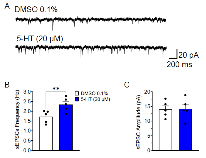 - Only 5-HT increased the spontaneous excitatory post-synaptic currents (sEPSCs), possibly due to its lack of selectivity for 5-HT receptor subtypes.