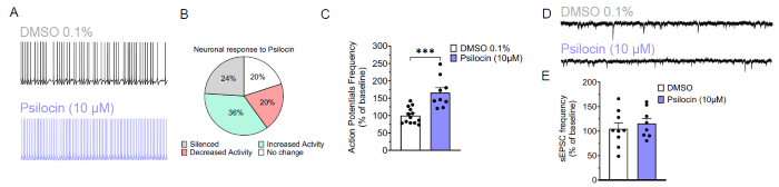 (A) Traces of PFC neurons' action potentials in response to 10 μM Psilocin (increased activity). (B) % of neurons that responded to 10 μM Psilocin with a: silencing (grey), increased activity (green), decreased activity (red), or no change (white) in action potential frequency. (C) Action potential frequency of neurons that exhibited an excitatory response to 10 μM Psilocin (p<0.001). (D) Representative traces of PFC neurons' excitatory post-synaptic currents in response to 10 μM Psilocin. (E) sEPSC frequency in response to 10 μM Psilocin. Image Credit: Elisabetta Perdona et al., in partnership with ELRIG (UK) Ltd.